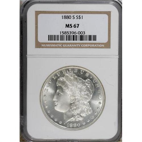 <B>1880-S $1 MS67 NGC.</B></I> NGC Census: (2504/229). PCGS Population (1428/139). Mintage: 8,900,000. Numismedia Wsl. Price for NGC/PCGS coin in MS67: $765. (#7118)<BR><BR><B>Coin Engraver:</B> George T. Morgan<BR><BR><b>Shipping:</b> Coins & Currency (<a target="_blank" href="http://www.heritageauctions.com/common/shipping.php">view shipping information</a>\)
