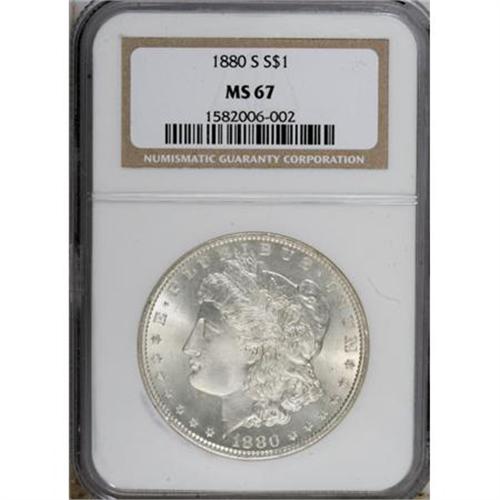 <B>1880-S $1 MS67 NGC.</B></I> Medium S. A remarkably smooth Superb Gem that has only a whisper of gold toning along the obverse periphery. The strike is good, with minor incompleteness limited to the hair above the ear.<BR><BR><B>Coin Engraver:</B> George T. Morgan<BR><BR><b>Shipping:</b> Coins & Currency (<a target="_blank" href="http://www.heritageauctions.com/common/shipping.php">view shipping information</a>)