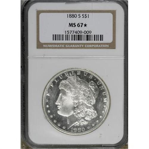 <B>1880-S $1 MS67 </B></I><img src="/images/star.gif" width="10" height="10" alt="" border="0"><B> NGC.</B></I> An outstanding selection for the type collector, exactingly struck with mild contrast between richly frosted devices and partly mirrored fields. Incredibly well-preserved with undeniable eye appeal.<BR><BR><B>Coin Engraver:</B> George T. Morgan<BR><BR><b>Shipping:</b> Coins & Currency (<a target="_blank" href="http://www.heritageauctions.com/common/shipping.php">view shipping information</a>)