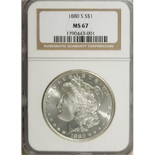 <B>1880-S $1 MS67 NGC.</B></I> This is a marvelous, frosty Superb Gem S-mint. Its white surfaces exhibit sharply struck devices and are immaculately preserved.<BR><BR><B>Coin Engraver:</B> George T. Morgan<BR><BR><b>Shipping:</b> Coins & Currency (<a target="_blank" href="http://www.heritageauctions.com/common/shipping.php">view shipping information</a>)