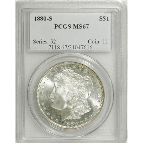 <B>1880-S $1 MS67 PCGS.</B></I> PCGS Population (0/0). NGC Census: (2451/220). Mintage: 8,900,000. Numismedia Wsl. Price for NGC/PCGS coin in MS67: $765. (#7118)<BR><BR><b>Shipping:</b> Coins & Currency (<a target="_blank" href="http://www.heritageauctions.com/common/shipping.php">view shipping information</a>)
