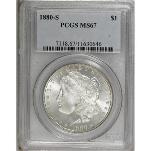 <B>1880-S $1 MS67 PCGS.</B></I> PCGS Population (1438/139). NGC Census: (2522/229). Mintage: 8,900,000. Numismedia Wsl. Price for NGC/PCGS coin in MS67: $765. (#7118)<BR><BR><B>Coin Engraver:</B> George T. Morgan<BR><BR><b>Shipping:</b> Coins & Currency (<a target="_blank" href="http://www.heritageauctions.com/common/shipping.php">view shipping information</a>)