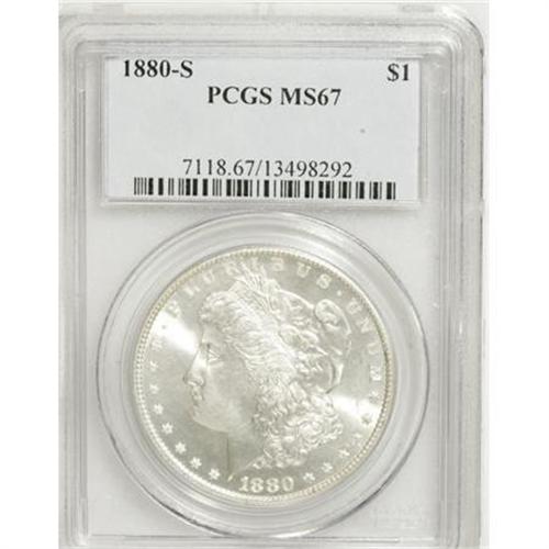 <B>1880-S $1 MS67 PCGS.</B></I> PCGS Population (1465/139). NGC Census: (2529/230). Mintage: 8,900,000. Numismedia Wsl. Price for NGC/PCGS coin in MS67: $755. (#7118)<BR><BR><B>Coin Engraver:</B> George T. Morgan<BR><BR><b>Shipping:</b> Coins & Currency (<a target="_blank" href="http://www.heritageauctions.com/common/shipping.php">view shipping information</a>)