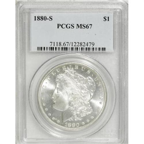 <B>1880-S $1 MS67 PCGS.</B></I> One of the classic type coins of the series, with the best produced surfaces, along with the 1881-S as a rule. Beautiful cartwheel luster with silver-white surfaces and blinding radiance, a super piece!<BR><BR><B>Coin Engraver:</B> George T. Morgan<BR><BR><b>Shipping:</b> Coins & Currency (<a target="_blank" href="http://www.heritageauctions.com/common/shipping.php">view shipping information</a>)