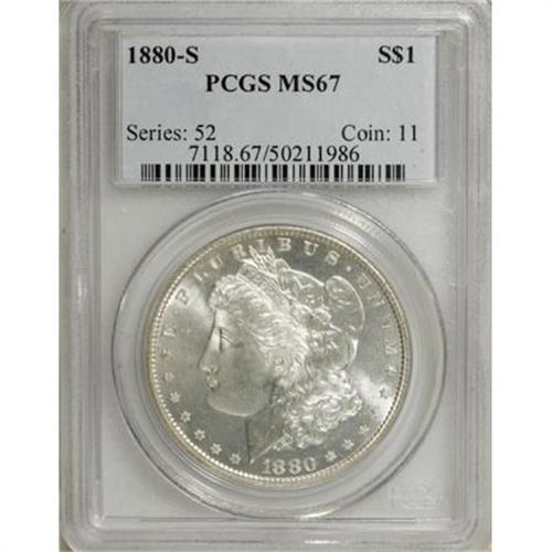 <B>1880-S $1 MS67 PCGS.</B></I> A well executed strike leaves exquisite delineation on the motifs of this fully lustrous Superb Gem. Untoned surfaces have been well cared for. Outstanding overall eye appeal.<BR><BR><B>Coin Engraver:</B> George T. Morgan<BR><BR><b>Shipping:</b> Coins & Currency (<a target="_blank" href="http://www.heritageauctions.com/common/shipping.php">view shipping information</a>)
