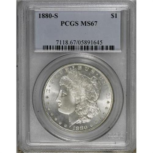<B>1880-S $1 MS67 PCGS.</B></I> Powerful luster and a solid strike contribute to the excellent eye appeal of this beautifully preserved Superb Gem. Subtle silver-gray haze visits otherwise untoned fields.<BR><BR><B>Coin Engraver:</B> George T. Morgan<BR><BR><b>Shipping:</b> Coins & Currency (<a target="_blank" href="http://www.heritageauctions.com/common/shipping.php">view shipping information</a>)