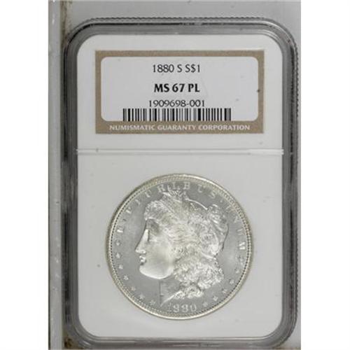 <B>1880-S $1 MS67 Prooflike NGC.</B></I> Medium S. A flashy Superb Gem whose field reflectivity approaches that of a Deep Mirror example. The devices are moderately frosty, and there is only a hint of gold patina.<BR><BR><b>Shipping:</b> Coins & Currency (<a target="_blank" href="http://www.heritageauctions.com/common/shipping.php">view shipping information</a>)