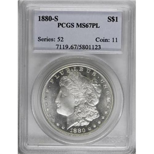 <B>1880-S $1 MS67 Prooflike PCGS.</B></I> Snow-white devices contrast against the deeply reflective fields. Brilliant and sharply struck with good portions of mint frost on the devices. A small graze on Liberty's lower jaw is noteworthy as the only mark on either of the central devices, and field blemishes are nearly as scarce. A beautiful and extraordinary prooflike Superb Gem.<BR><BR><B>Coin Engraver:</B> George T. Morgan<BR><BR><b>Shipping:</b> Coins & Currency (<a target="_blank" href="http://www.heritageauctions.com/common/shipping.php">view shipping information</a>)