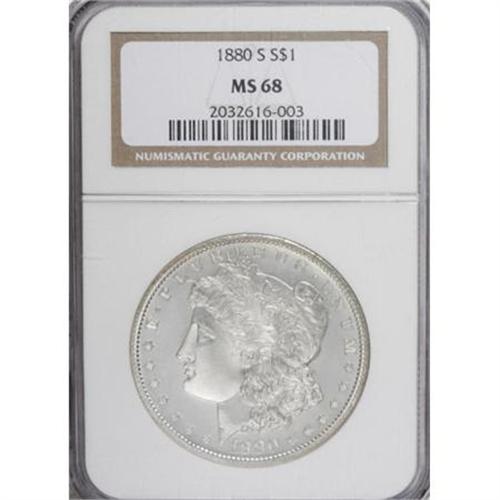 <B>1880-S $1 MS68 NGC.</B></I> The 1880-S Morgan dollar is one of the most common early issues in the immensely popular series, and examples are easy to obtain at grade levels all the way through MS67! Only at MS68 does this date finally become scarce. The current offering is a truly beautiful coin that appears to have been saved very early from either circulation or long-term bag storage, as unlikely as that seems. The piece comes about as close to being pristine as possible for a business strike silver dollar. Fully struck with a layer of light cloudiness over the fields and wonderfully clean devices. A great Superb Gem from the San Francisco Mint. <BR><I>From the Reuben Reinstein Collection.</B></I><BR><BR><b>Shipping:</b> Coins & Currency (<a target="_blank" href="http://www.heritageauctions.com/common/shipping.php">view shipping information</a>)