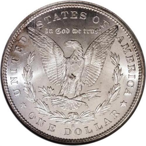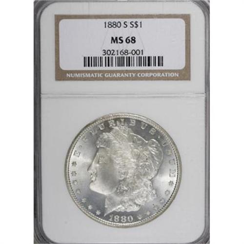 <B>1880-S $1 MS68 NGC.</B></I> The surfaces are almost impossibly bright, essentially brilliant, and highly frosted on this Superb Gem. Few coins of any type will ever reveal the dynamic cartwheel effects seen here. The razor-sharp striking details on every feature are notable and make this piece even more important as a type coin. There is certainly nothing that one could call an "abrasion" on either side. For future identification, a small area of dark reddish-charcoal color is seen at the base of the eagle's breast. A flashy, dazzling, and memorable coin in every respect.<BR><BR><B>Coin Engraver:</B> George T. Morgan<BR><BR><b>Shipping:</b> Coins & Currency (<a target="_blank" href="http://www.heritageauctions.com/common/shipping.php">view shipping information</a>)