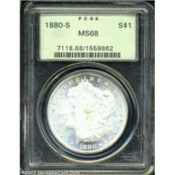 <table><tr><td><TABLE cellSpacing=0 cellPadding=0 width="100%" bgColor=#000000 border=0><TBODY> <TR><TD width="100%"><TABLE cellSpacing=1 cellPadding=3 width="100%" border=0><TBODY><TR><TD width="100%" bgColor=#79735c><FONT face=arial color=#ffffff size=3><B>Description</B> </FONT></TD></TR><TR><TD width="100%" bgColor=#ffffff><FONT face=arial size=2><B>1880-S $1 MS68 PCGS.</B></I> What a pleasure it is to gaze upon the almost impossibly bright, essentially brilliant, and highly frosty surfaces of this notable Superb Gem. Few coins of any type will ever reveal the dynamic cartwheel effects on display. The razor-sharp striking details on every feature are notable, as such, especially for a mintmarked Morgan dollar. There is certainly nothing that one could call an "abrasion", on either side, but a few scattered, wispy marks are evident on the reverse, using magnification, while the obverse seems blemish-free. A flashy, dazzling, and memorable coin in every respect. </FONT></TD></TR></TBODY></TABLE></TD></TR></TBODY></TABLE><BR><A name=PricesRealized></A><TABLE cellSpacing=0 cellPadding=0 width="100%" bgColor=#000000 border=0><TBODY><TR><TD width="100%"><TABLE cellSpacing=1 cellPadding=3 width="100%" border=0><TBODY><TR><TD width="100%" bgColor=#79735c><A name=PR><FONT face=arial color=#ffffff size=3><B>Previous Prices from Heritage Auctions</B> </FONT></A></TD></TR><TR><TD bgColor=#f6f6ed><TABLE cellSpacing=0 cellPadding=0 width="100%" border=1><TBODY><TR><TD align=middle width="33%"><B>Date</B></TD><TD align=middle width="33%"><B>Service</B></TD><TD align=middle width="33%"><B>Price</B></TD></TR><TR bgColor=whitesmoke><TD width="33%"><B>05/03/2003</B></TD><TD width="33%">NGC</TD><TD width="33%">$2,070.00</TD></TR><TR bgColor=whitesmoke><TD width="33%"><B>01/11/2003</B></TD><TD width="33%">PCGS</TD><TD width="33%">$3,450.00</TD></TR><TR bgColor=whitesmoke><TD width="33%"><B>01/11/2003</B></TD><TD width="33%">PCGS</TD><TD width="33%">$2,185.00</TD></TR><TR bgColor=whitesmoke><TD width="33%"><B>09/28/2002</B></TD><TD width="33%">NGC</TD><TD width="33%">$2,070.00</TD></TR><TR bgColor=whitesmoke><TD width="33%"><B>07/30/2002</B></TD><TD width="33%">NGC</TD><TD width="33%">$2,127.50</TD></TR><TR bgColor=whitesmoke><TD width="33%"><B>01/12/2002</B></TD><TD width="33%">NGC</TD><TD width="33%">$1,610.00</TD></TR><TR bgColor=whitesmoke><TD width="33%"><B>11/17/2001</B></TD><TD width="33%">NGC</TD><TD width="33%">$2,070.00</TD></TR><TR bgColor=whitesmoke><TD width="33%"><B>08/05/2001</B></TD><TD width="33%">NGC</TD><TD width="33%">$1,868.75</TD></TR><TR bgColor=whitesmoke><TD width="33%"><B>10/06/2000</B></TD><TD width="33%">NGC</TD><TD width="33%">$2,357.50</TD></TR><TR bgColor=whitesmoke><TD width="33%"><B>09/13/1997</B></TD><TD width="33%">PCGS</TD><TD width="33%">$2,875.00</TD></TR><TR bgColor=whitesmoke><TD width="33%"><B>05/01/2001</B></TD><TD width="33%">PCGS</TD><TD width="33%">$2,185.00</TD></TR><TR bgColor=whitesmoke><TD width="33%"><B>08/09/2000</B></TD><TD width="33%">PCGS</TD><TD width="33%">$1,725.00</TD></TR><TR bgColor=whitesmoke><TD width="33%"><B>10/01/2001</B></TD><TD width="33%">NGC</TD><TD width="33%">$1,782.00</TD></TR><TR bgColor=whitesmoke><TD width="33%"><B>12/01/1999</B></TD><TD width="33%">NGC</TD><TD width="33%">$2,090.00</TD></TR><TR bgColor=whitesmoke><TD width="33%"><B>02/01/2000</B></TD><TD width="33%">NGC</TD><TD width="33%">$2,185.00</TD></TR><TR bgColor=whitesmoke><TD width="33%"><B>11/01/1999</B></TD><TD width="33%">PCGS</TD><TD width="33%">$2,990.00</TD></TR><TR bgColor=whitesmoke><TD width="33%"><B>11/01/1998</B></TD><TD width="33%">PCGS</TD><TD width="33%">$2,760.00</TD></TR><TR bgColor=whitesmoke><TD width="33%"><B>01/01/1999</B></TD><TD width="33%">PCGS</TD><TD width="33%">$3,220.00</TD></TR><TR bgColor=whitesmoke><TD width="33%"><B>03/01/1999</B></TD><TD width="33%">PCGS</TD><TD width="33%">$2,530.00</TD></TR><TR bgColor=whitesmoke><TD width="33%"><B>03/01/1999</B></TD><TD width="33%">PCGS</TD><TD width="33%">$2,645.00</TD></TR></TBODY></TABLE></TD></TR><TR><TD bgColor=#ffffff><FONT face=arial size=1 ?>PLEASE NOTE: All prices realized reflect the final hammer price PLUS the buyer's premium in auctions that charge a buyer's premium. Each item has a notation at the top of the listing indicating whether that lot included a buyer's premium. Example: A item that sells with a final hammer price of $100 and a 20% buyer's premium will display with a price realized of $120. All information listed is intended to be as accurate as possible, but errors are possible. Please use this guide carefully and inform us of any inaccuracies. </FONT></TD></TR></TBODY></TABLE></TD></TR></TBODY></TABLE><BR><TABLE cellSpacing=0 cellPadding=0 width="100%" bgColor=#000000 border=0><TBODY><TR><TD width="100%"><TABLE cellSpacing=1 cellPadding=3 width="100%" border=0><TBODY><TR><TD width="100%" bgColor=#79735c colSpan=6><FONT face=arial color=#ffffff size=3><B>Price Guide*</B> </FONT></TD></TR><TR bgColor=#f6f6ed><TD align=middle><B>Grade</B> </TD><TD align=middle><B>Coin World<BR>(Trends)</B> </TD><TD align=middle><B>Numismedia<BR>Retail</B> </TD><TD align=middle><B>Numismedia<BR>Wholesale</B> </TD><TD align=middle><B>Coin<BR>Universe</B> </TD><TD align=middle><B>Heritage<BR>Value Index</B> </TD></TR><TR bgColor=#ffffff><TD align=middle>67</TD><TD align=right>---</TD><TD align=right>$710.00</TD><TD align=right>$565.00</TD><TD align=right>$1,050.00</TD><TD align=right>$795.50</TD></TR><TR style="FONT-WEIGHT: bold" bgColor=#cccfdd><TD align=middle>68</TD><TD align=right>---</TD><TD align=right>---</TD><TD align=right>$2,250.00</TD><TD align=right>$3,250.00</TD><TD align=right>$2,188.03</TD></TR><TR bgColor=#ffffff><TD align=middle>69</TD><TD align=right>---</TD><TD align=right>---</TD><TD align=right>$37,500.00</TD><TD align=right>---</TD><TD align=right>---</TD></TR><TR bgColor=#ffffff><TD colSpan=6><FONT size=1>*All information listed is intended to be as accurate as possible, but error