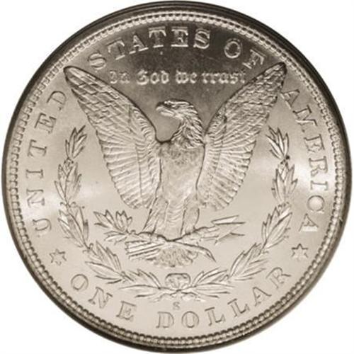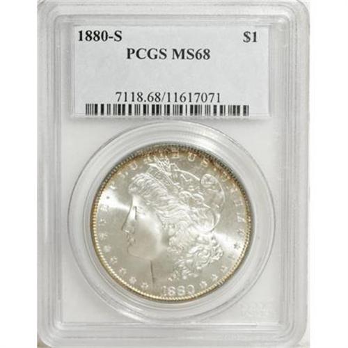 <B>1880-S $1 MS68 PCGS.</B></I> A quintessential Morgan dollar in top-flight condition, absolutely breathtaking and seemingly of unsurpassable quality--even though each service has certified a few pieces finer of this issue, one of the best-produced in the Morgan dollar series. The surfaces are largely silver-white, but infused with a ring of amber-gold and cobalt-blue at the immediate rim. Extensive examination with a loupe reveals surfaces that are nearly flawless, a stray tick on Liberty's chin the only exception. An interesting series of small, raised die lines on Liberty's cheek is evidence of die polishing down into the recessed details of the die, and inconsequential roller marks appear above the ear. Glorious cartwheel luster and a bold strike complete the package. PCGS has certified five coins finer--at least numerically (7/07).<BR><BR><B>Coin Engraver:</B> George T. Morgan<BR><BR><b>Shipping:</b> Coins & Currency (<a target="_blank" href="http://www.heritageauctions.com/common/shipping.php">view shipping information</a>\)
