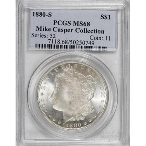<B>1880-S $1 MS68 PCGS.</B></I> Ex: Mike Casper Collection. A well executed strike leaves sharp definition on the motifs, including the hair over Liberty's ear and the eagle's breast feathers. The barest hint of occasional light tan color is visible under magnification, but does not obscure the noticeable field-device contrast. Immaculately preserved throughout.<BR><BR><B>Coin Engraver:</B> George T. Morgan<BR><BR><b>Shipping:</b> Coins & Currency (<a target="_blank" href="http://www.heritageauctions.com/common/shipping.php">view shipping information</a>)