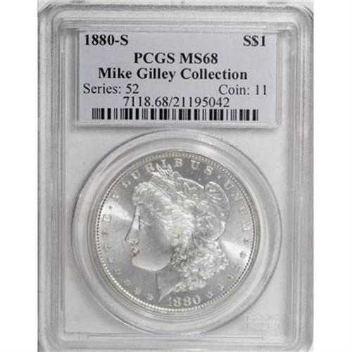 <B>1880-S $1 MS68 PCGS.</B></I> Ex: Mike Gilley Collection. Large S. Magnificent cartwheel luster invigorates this razor-sharp and essentially immaculate Superb Gem. Hints of pale gold toning further confirm the originality. The collector in search of the finest quality silver type holding need look no further.<BR><BR><B>Coin Engraver:</B> George T. Morgan<BR><BR><b>Shipping:</b> Coins & Currency (<a target="_blank" href="http://www.heritageauctions.com/common/shipping.php">view shipping information</a>)
