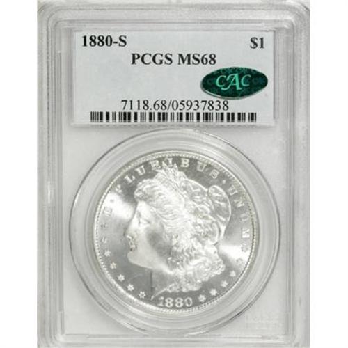 <B>1880-S $1 MS68 PCGS. CAC.</B></I> This is one of the finest MS68 Morgan dollars we have handled, and the CAC experts like the coin as well. The surfaces are entirely brilliant with frosty devices and reflective fields. The PCGS population data shows more than 100 1880-S Morgans graded MS68, yet with just five finer coins. The population seems plentiful, but the number of '80-S Morgans submitted in all grades must be considered, and the total is substantially more than 100,000 coins.<BR><BR><B>Coin Engraver:</B> George T. Morgan<BR><BR><b>Shipping:</b> Coins & Currency (<a target="_blank" href="http://www.heritageauctions.com/common/shipping.php">view shipping information</a>)