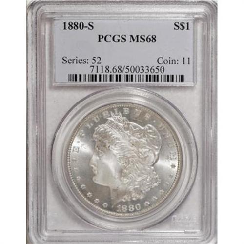 <B>1880-S $1 MS68 PCGS.</B></I> This is an unbelievable Superb Gem that exhibits fully lustrous, untoned surfaces that are impeccably preserved. A penetrating strike sharpens all of the design features. The 1880-S is one of the more plentiful Morgan dollars, second only to the 1881-S in availability (David Bowers, 2006).<BR><I>From The Motor City Collection.</B></I><BR><BR><B>Coin Engraver:</B> George T. Morgan<BR><BR><b>Shipping:</b> Coins & Currency (<a target="_blank" href="http://www.heritageauctions.com/common/shipping.php">view shipping information</a>)