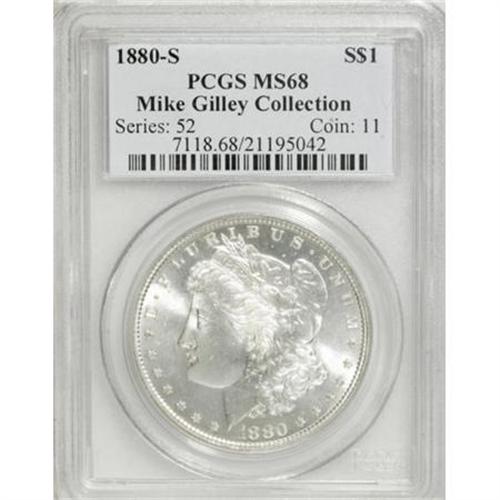 <B>1880-S $1 MS68 PCGS.</B></I> Ex: Mike Gilley Collection. Large S. Magnificent cartwheel luster invigorates this razor-sharp and immaculate Superb Gem. The surfaces are brilliant and the thick mint frost races around the coin as it is tilted beneath a light. The collector in search of the finest quality silver type need look no further.<BR><BR><B>Coin Engraver:</B> George T. Morgan<BR><BR><b>Shipping:</b> Coins & Currency (<a target="_blank" href="http://www.heritageauctions.com/common/shipping.php">view shipping information</a>)