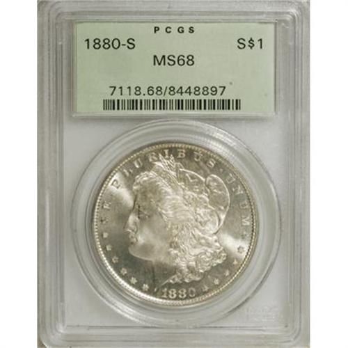 <B>1880-S $1 MS68 PCGS.</B></I> Large S. This meticulously struck and magnificently lustrous Superb Gem has gorgeous preservation and only a whisper of brown toning. A marvelous and virtually unimprovable silver type coin that somehow survived in nearly immaculate condition despite its production for circulation. Encapsulated in a green label holder.<BR><I>From The Jimmy G. PCGS Registry Collection of Morgan Dollars with Varieties.</B></I><BR><BR><B>Coin Engraver:</B> George T. Morgan<BR><BR><b>Shipping:</b> Coins & Currency (<a target="_blank" href="http://www.heritageauctions.com/common/shipping.php">view shipping information</a>)