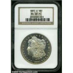 <TABLE cellSpacing=0 cellPadding=0 width="100%" bgColor=#000000 border=0><TBODY><TR><TD width="100%"><TABLE cellSpacing=1 cellPadding=3 width="100%" border=0><TBODY><TR><TD width="100%" bgColor=#79735c><FONT face=arial color=#ffffff size=3><B>Description</B> </FONT></TD></TR><TR><TD width="100%" bgColor=#ffffff><FONT face=arial size=2><B>1880-S $1 MS68 Prooflike NGC.</B></I> If one were looking for the ultimate type coin, this just might be it. The fields are nicely mirrored and the devices heavily frosted. Well struck, the obverse shows just the slightest accent of color while the reverse is brilliant. A nearly flawless business strike Morgan dollar. Population: 9 in 68, 0 finer (7/03). </FONT></TD></TR></TBODY></TABLE></TD></TR></TBODY></TABLE><BR><A name=PricesRealized></A><TABLE cellSpacing=0 cellPadding=0 width="100%" bgColor=#000000 border=0><TBODY><TR><TD width="100%"><TABLE cellSpacing=1 cellPadding=3 width="100%" border=0><TBODY><TR><TD width="100%" bgColor=#79735c><A name=PR><FONT face=arial color=#ffffff size=3><B>Previous Prices from Heritage Auctions</B> </FONT></A></TD></TR><TR><TD bgColor=#f6f6ed><TABLE cellSpacing=0 cellPadding=0 width="100%" border=1><TBODY><TR><TD align=middle width="33%"><B>Date</B></TD><TD align=middle width="33%"><B>Service</B></TD><TD align=middle width="33%"><B>Price</B></TD></TR><TR bgColor=whitesmoke><TD width="33%"><B>11/01/1999</B></TD><TD width="33%">PCGS</TD><TD width="33%">$4,600.00</TD></TR></TBODY></TABLE></TD></TR><TR><TD bgColor=#ffffff><FONT face=arial size=1 ?>PLEASE NOTE: All prices realized reflect the final hammer price PLUS the buyer's premium in auctions that charge a buyer's premium. Each item has a notation at the top of the listing indicating whether that lot included a buyer's premium. Example: A item that sells with a final hammer price of $100 and a 20% buyer's premium will display with a price realized of $120. All information listed is intended to be as accurate as possible, but errors are possible. Please use this guide carefully and inform us of any inaccuracies. </FONT></TD></TR></TBODY></TABLE></TD></TR></TBODY></TABLE><BR><TABLE cellSpacing=0 cellPadding=0 width="100%" bgColor=#000000 border=0><TBODY><TR><TD width="100%"><TABLE cellSpacing=1 cellPadding=3 width="100%" border=0><TBODY><TR><TD width="100%" bgColor=#79735c colSpan=6><FONT face=arial color=#ffffff size=3><B>Price Guide*</B> </FONT></TD></TR><TR bgColor=#f6f6ed><TD align=middle><B>Grade</B> </TD><TD align=middle><B>Coin World<BR>(Trends)</B> </TD><TD align=middle><B>Numismedia<BR>Retail</B> </TD><TD align=middle><B>Numismedia<BR>Wholesale</B> </TD><TD align=middle><B>Coin<BR>Universe</B> </TD><TD align=middle><B>Heritage<BR>Value Index</B> </TD></TR><TR bgColor=#ffffff><TD align=middle>67</TD><TD align=right>---</TD><TD align=right>---</TD><TD align=right>$850.00</TD><TD align=right>$1,600.00</TD><TD align=right>$960.00</TD></TR><TR style="FONT-WEIGHT: bold" bgColor=#cccfdd><TD align=middle>68</TD><TD align=right>---</TD><TD align=right>---</TD><TD align=right>$5,150.00</TD><TD align=right>---</TD><TD align=right>---</TD></TR><TR bgColor=#ffffff><TD align=middle>69</TD><TD align=right>---</TD><TD align=right>---</TD><TD align=right>$85,000.00</TD><TD align=right>---</TD><TD align=right>---</TD></TR><TR bgColor=#ffffff><TD colSpan=6><FONT size=1>*All information listed is intended to be as accurate as possible, but errors are possible. No item may be returned or refused based on this information which is provided as a service to our customers. You should contact each pricing source directly to determine the accuracy of this information. </FONT></TD></TR></TBODY></TABLE></TD></TR></TBODY></TABLE><BR><TABLE cellSpacing=0 cellPadding=0 width="100%" bgColor=#000000 border=0><TBODY><TR><TD width="100%"><TABLE cellSpacing=1 cellPadding=3 width="100%" border=0><TBODY><TR><TD width="100%" bgColor=#79735c><FONT face=arial color=#ffffff size=3><B>Population Guide</B> </FONT></TD></TR><TR bgColor=#ffffff><TD align=middle><!-- Begin Output of Population Grid--><TABLE cellSpacing=0 cellPadding=0 width="100%" border=0><TBODY><TR><TD vAlign=center><TABLE cellSpacing=0 width="100%" border=1 cellsadding="3"><TBODY><TR><TD vAlign=center><TABLE cellSpacing=0 cellPadding=3 width="100%" border=1><TBODY><TR><TD vAlign=center align=middle bgColor=#f0f1e8 colSpan=2 <CENTER><FONT face=Arial size=2><B>PCGS Pop </B></FONT><CENTER></CENTER></TD><TD vAlign=center align=middle bgColor=#f0f1e8 colSpan=2><CENTER><FONT face=Arial size=2><B>NGC Pop</B></CENTER></FONT></TD></TR><TR><TD vAlign=center><FONT face=Arial size=2>(68)</FONT> </TD><TD vAlign=center align=right><FONT face=Arial size=2>16</FONT> </TD><TD vAlign=center><FONT face=Arial size=2>(68)</FONT> </TD><TD vAlign=center align=right><FONT face=Arial size=2>9</FONT> </TD></TR><TR><TD vAlign=center><FONT face=Arial size=2>(>68)</FONT> </TD><TD vAlign=center align=right><FONT face=Arial size=2>1</FONT> </TD><TD vAlign=center><FONT face=Arial size=2>(>68)</FONT> </TD><TD vAlign=center align=right><FONT face=Arial size=2>0</FONT> </TD></TR></TBODY></TABLE></TD></TR></TBODY></TABLE></TD></TR></TBODY></TABLE><!-- End Output of Population Grid--> Important notice: Heritage usually auctions material at the rate of 200-250 lots per hour. On some occasions eBay Live bid software or the Internet may not be able to keep up with the pace of the auction. We recommend placing a realistic absentee bid now as insurance to avoid disappointment. Occasionally the auctioneer may eliminate or reject an eBay Live bid, and the auctioneer may also reopen a lot after the close of the eBay live bidding (usually because we missed an audience bid), and may reject your bid even if it shows you as the winning bidder. By bidding via eBay Live, you agree that Heritage may award the lot to another bidder at its sole discretion under the circumstances described above or any other reasonable circumstances. Also please note that all Heritage lots purchased through eB