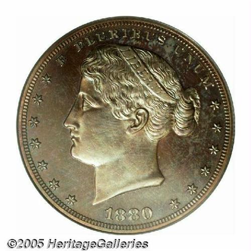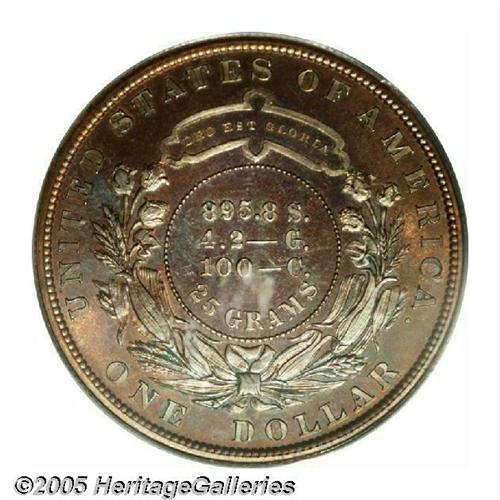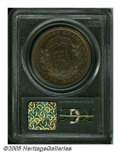 <B>1880<S$1> Metric Dollar, Judd-1649, Pollock-1849, R.7, PR65 Red and Brown PCGS.</B></I> Metric dollar pattern designed by George Morgan, featuring a bland, rarely seen head of Liberty brushed back and fastened in a bun and with a wide ribbon at the top of the head. The reverse is the standard Metric dollar design with DEO EST GLORIA featured prominently above the composition in the center. Struck in copper with a reeded edge. The red and lilac surfaces are greatly enhanced by the exceptionally deep mirrored reflectivity in the fields. One of about a dozen pieces believed known.