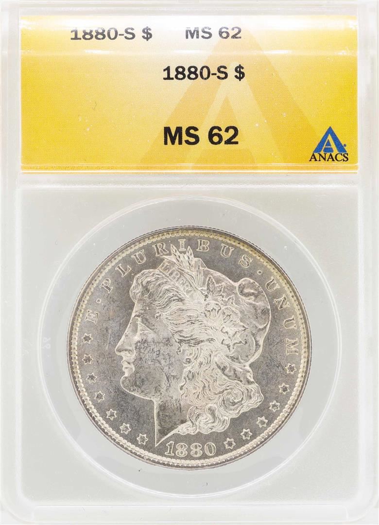 One 1880-S $1 Morgan Silver Dollar Coin ANACS MS62. ANACS Certified.