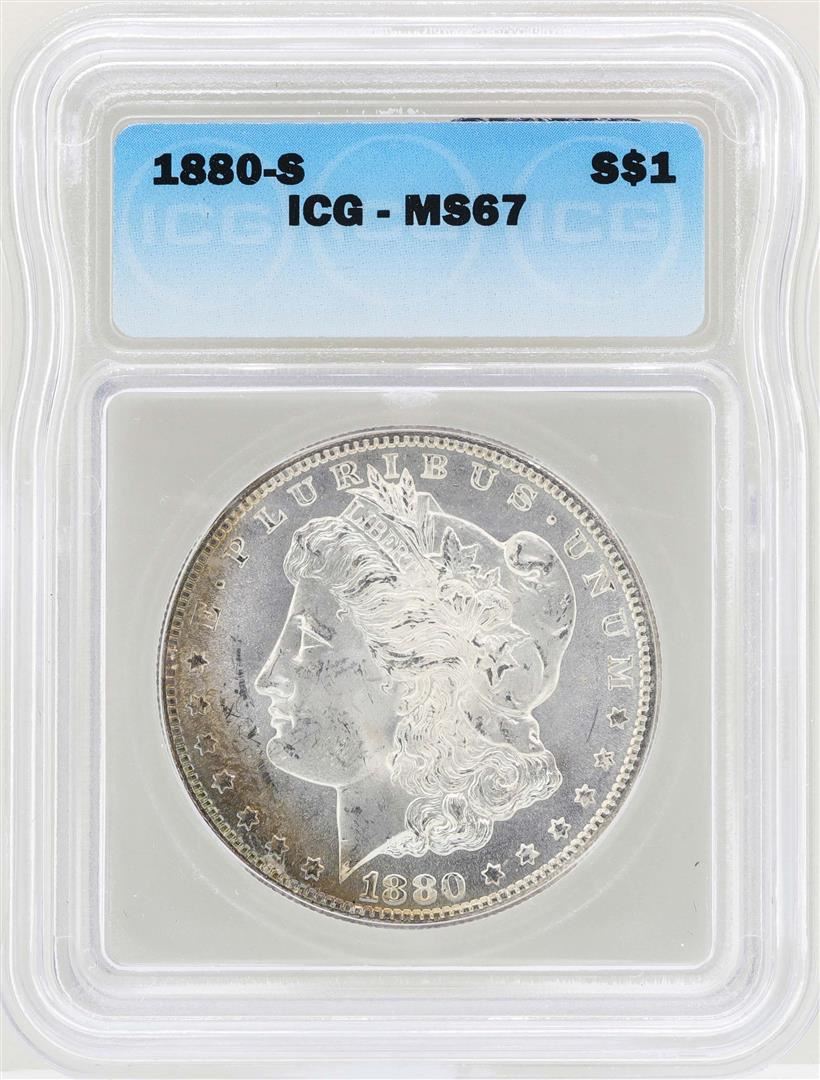 One 1880-S $1 Morgan Silver Dollar Coin ICG MS67. ICG Certified.