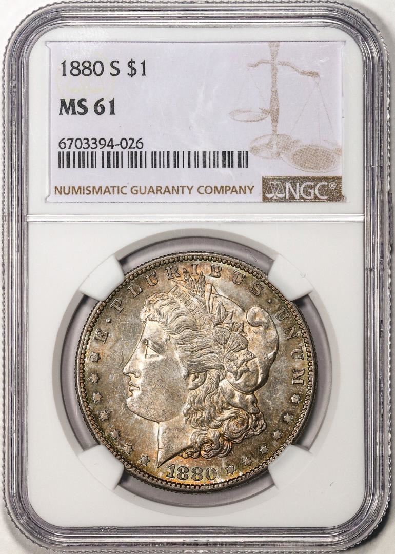 One 1880-S $1 Morgan Silver Dollar Coin NGC MS61 Nice Toning. NGC Certified.