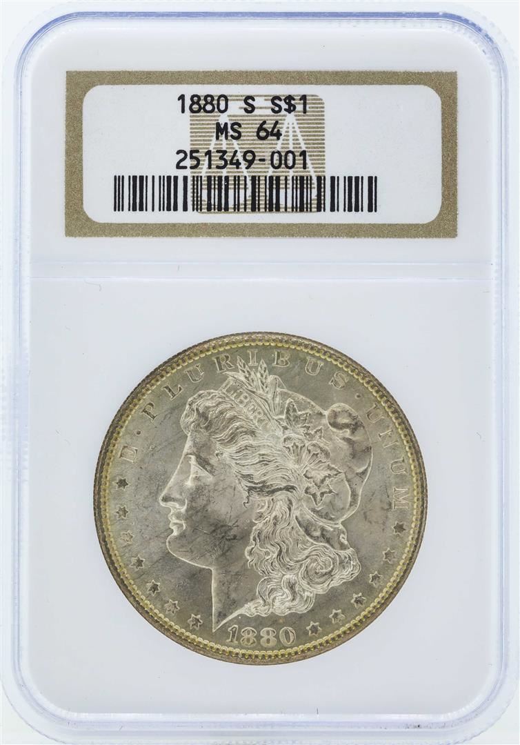 One 1880-S $1 Morgan Silver Dollar Coin NGC MS64. NGC Certified.