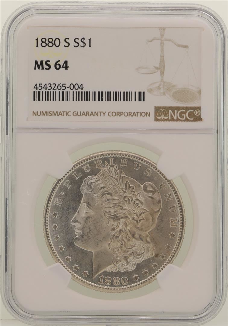 One 1880-S $1 Morgan Silver Dollar Coin NGC MS64. NGC Certified.