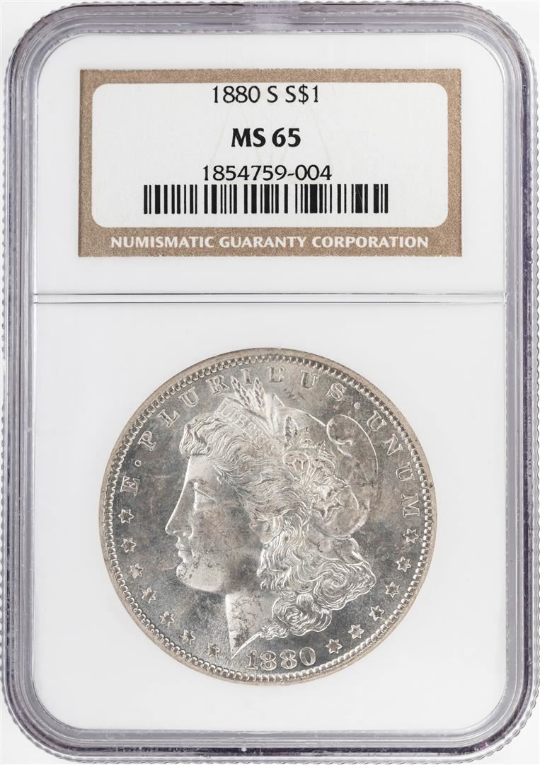 One 1880-S $1 Morgan Silver Dollar Coin NGC MS65. NGC Certified.