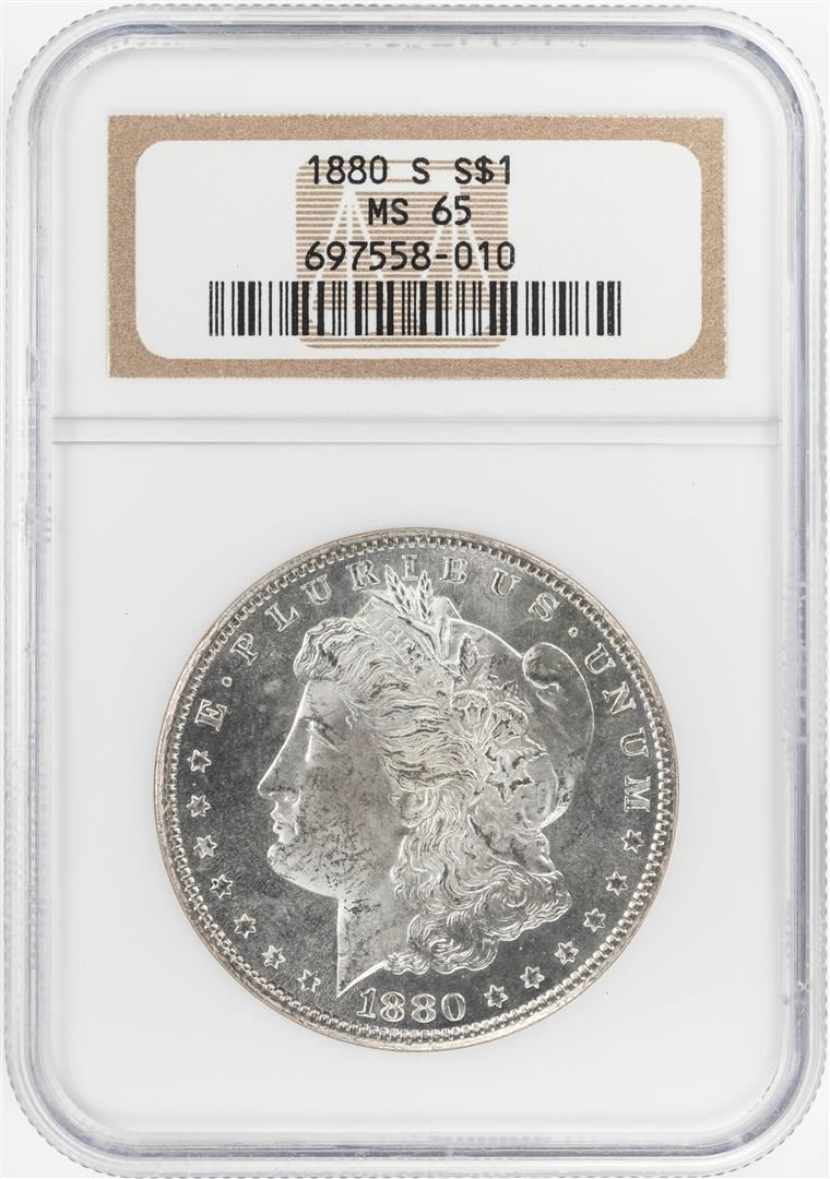 One 1880-S $1 Morgan Silver Dollar Coin NGC MS65. NGC Certified.