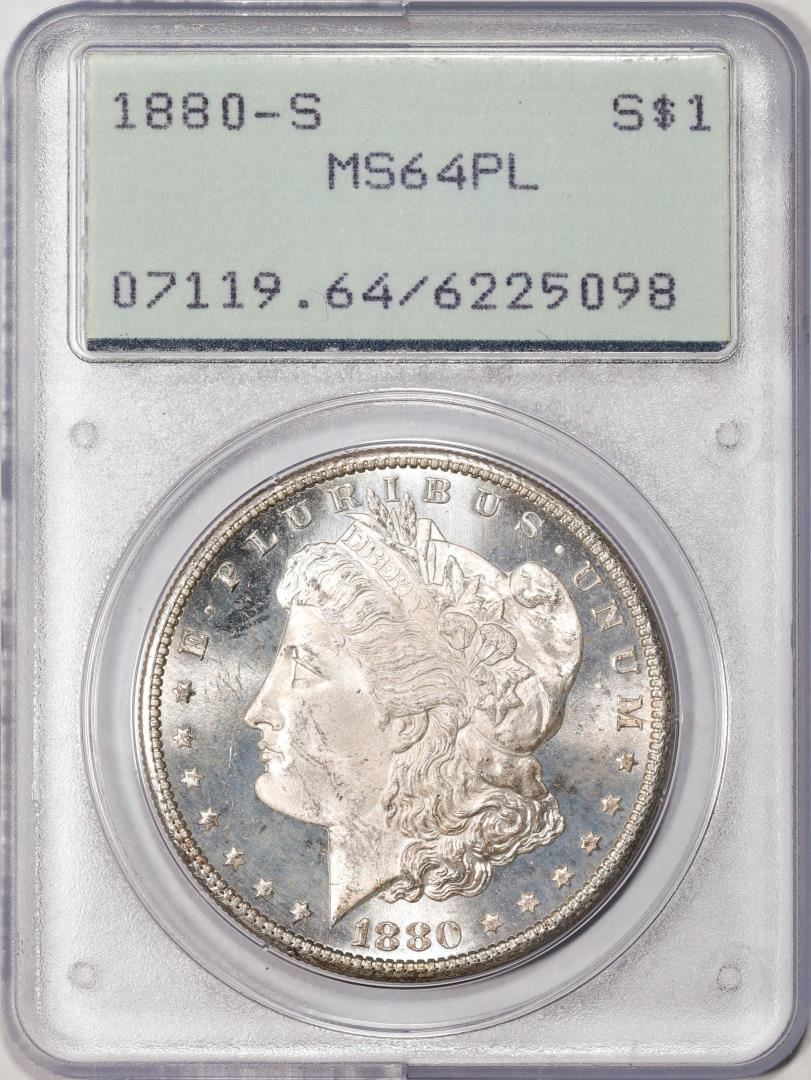 1880-S $1 Morgan Silver Dollar Coin PCGS MS64PL Old Rattler Holder