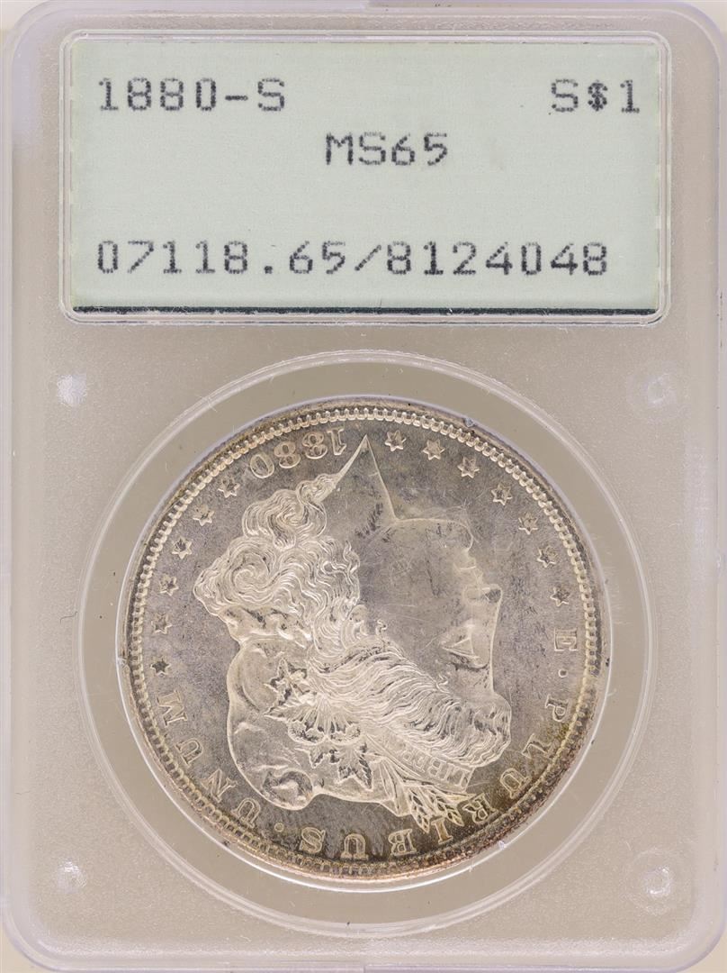 One 1880-S $1 Morgan Silver Dollar Coin PCGS MS65 Old Green Rattler. PCGS Certified.