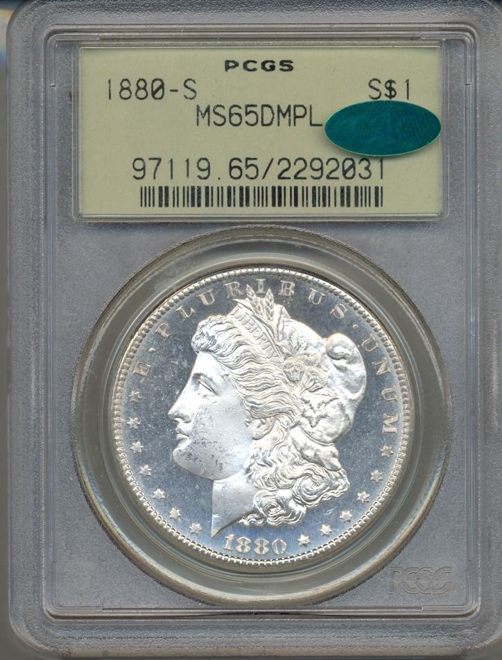 One 1880-S $1 Morgan Silver Dollar Coin PCGS MS65DMPL CAC.