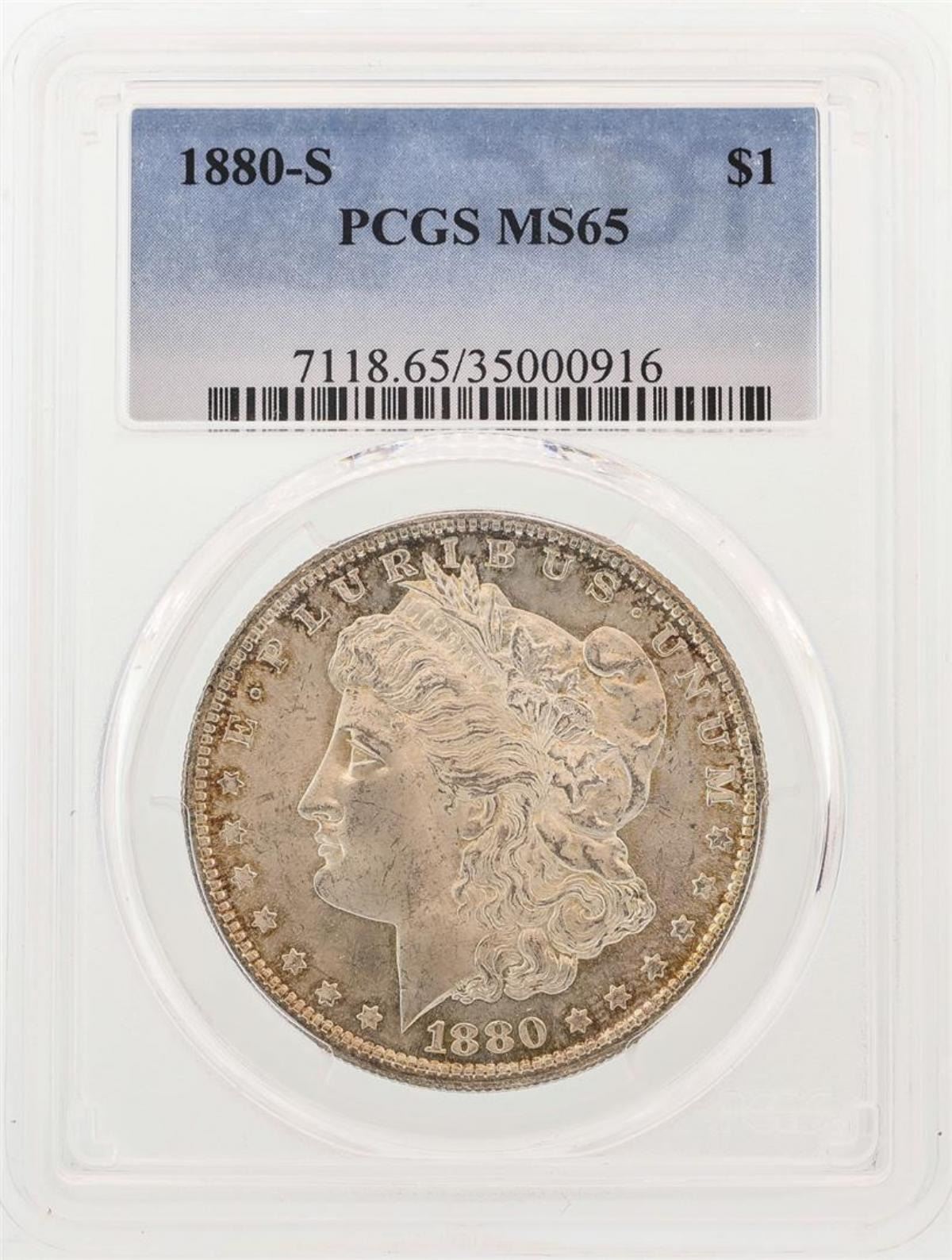 One 1880-S $1 Morgan Silver Dollar Coin PCGS MS65. PCGS Certified.