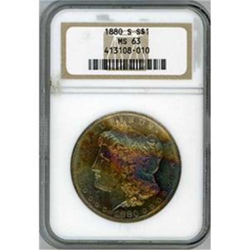 Gorgeous multicolor toning in bands across the obverse. A splendid pick if you want a toned specimen for your collection. The reverse white, with golden brown at the rims.