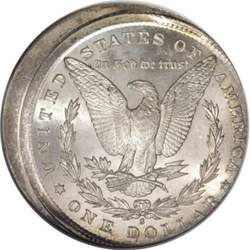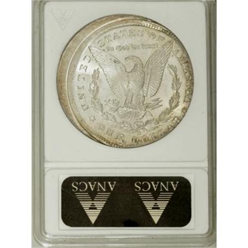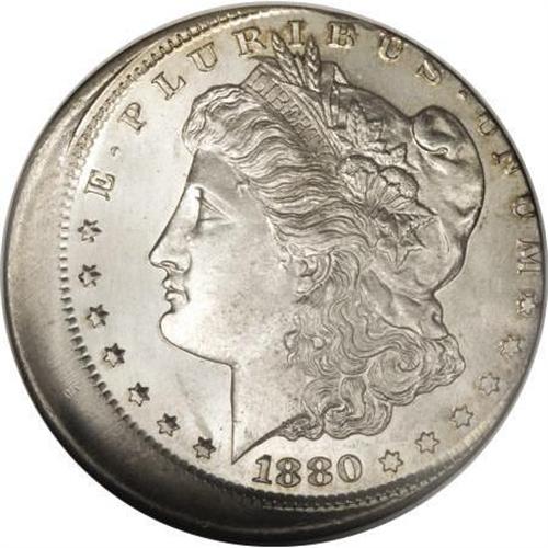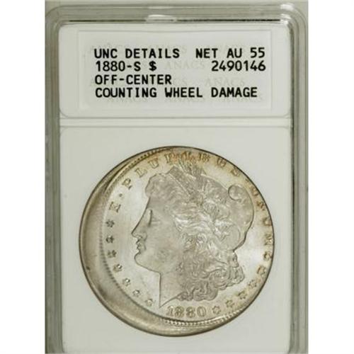 <B>1880-S $1 Morgan Dollar--Off-Center, Counting Wheel Damage--ANACS. Unc Details, Net AU55.</B></I> The 1880-S, considered one of the most ubiquitous Morgan dollar issues, has long been considered an available and commonplace issue across all grades. This dramatic off-center piece, by contrast, is anything but ordinary. The coin was struck between 10% and 15% off-center in the direction of 2 o'clock, which cut off part of the legend E PLURIBUS UNUM on the obverse and the outermost tips of a few letters on the reverse. The struck regions have delicate gold, pink, and silver-gray patina, while the unstruck regions offer deeper cloud-gray haze. A counting wheel mark, visible as a concave region of shiny, disturbed luster to the left of Liberty's nose, triggered the net grade, but this flaw has little impact on the visual appeal. A striking 19th century error piece of considerable size.<BR><BR><b>Shipping:</b> Coins & Currency (<a target="_blank" href="http://www.heritageauctions.com/common/shipping.php">view shipping information</a>)