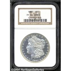 <B>1880<S$1> PR64 Cameo NGC.</B></I> The nicely mirrored fields reflect against nicely frosted devices, particularly on the obverse. A very thin coating of silver-gold patina equally covers each side of this desirable type coin. Elusive in this high grade. <BR><BR><B>Important notice:</B> Heritage usually auctions material at the rate of 200-250 lots per hour. On some occasions eBay Live bid software or the Internet may not be able to keep up with the pace of the auction. We recommend placing a realistic absentee bid now as insurance to avoid disappointment. Occasionally the auctioneer may eliminate or reject an eBay Live bid, and the auctioneer may also reopen a lot after the close of the eBay live bidding (usually because we missed an audience bid), and may reject your bid even if it shows you as the winning bidder. By bidding via eBay Live, you agree that Heritage may award the lot to another bidder at its sole discretion under the circumstances described above or any other reasonable circumstances. Since eBay bids are not shown to us until we open the lot on the floor, we treat those bids just like floor bids. In most cases the floor responds before the eBay bid is presented to us, due to Internet lag time, so for consistency we have made it a policy that floor bids are always considered first over tie eBay live bids. Also please note that all Heritage lots purchased through eBay Live carry a 20% Buyer's Premium. Please make sure you read the Terms and Conditions before you bid. </span></font></tr></table></td></tr></table>