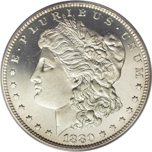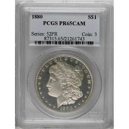 <B>1880 S$1 PR65 Cameo PCGS.</B></I> Boldly impressed cream-colored devices emerge from watery surfaces that possess delicate golden patina. Two wispy hairlines are scarcely detectable on the cheek, and the surfaces are nearly free from post-minting distractions otherwise. A delightful example of this early proof Morgan, one of only 1,335 specimens coined. Population: 8 in 65 Cameo, 22 finer (2/07).<BR><BR><b>Shipping:</b> Coins & Currency (<a target="_blank" href="http://www.heritageauctions.com/common/shipping.php">view shipping information</a>)