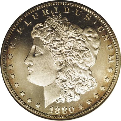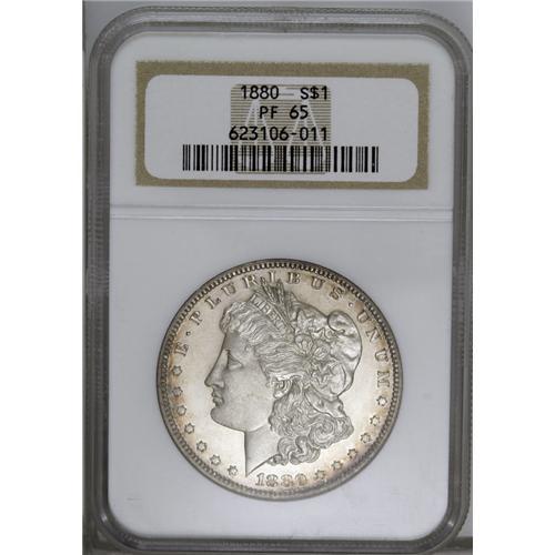 <B>1880<img border='0' src='http://www.heritagecoins.com/images/star.gif' width=10 height=10>$1> PR65 NGC.</B></I> This is a splendid Cameo proof, although it is not designated as such by NGC. Perhaps it could be reviewed by the Florida grading service for such a designation. Both sides are essentially brilliant with pale gold iridescence along the borders.<BR><I>From The David L. Goodwin Collection.</B></I> <BR><BR><B>Important notice:</B> Heritage usually auctions material at the rate of 200-250 lots per hour. On some occasions eBay Live bid software or the Internet may not be able to keep up with the pace of the auction. We recommend placing a realistic absentee bid now as insurance to avoid disappointment. Occasionally the auctioneer may eliminate or reject an eBay Live bid, and the auctioneer may also reopen a lot after the close of the eBay live bidding (usually because we missed an audience bid), and may reject your bid even if it shows you as the winning bidder. By bidding via eBay Live, you agree that Heritage may award the lot to another bidder at its sole discretion under the circumstances described above or any other reasonable circumstances. Since eBay bids are not shown to us until we open the lot on the floor, we treat those bids just like floor bids. In most cases the floor responds before the eBay bid is presented to us, due to Internet lag time, so for consistency we have made it a policy that floor bids are always considered first over tie eBay live bids. Also please note that all Heritage lots purchased through eBay Live carry a 20% Buyer's Premium. Please make sure you read the Terms and Conditions before you bid. This lot is being auctioned in conjunction with a live floor auction by Heritage Galleries & Auctioneers. All final auction and invoice information will be supplied by Heritage Galleries & Auctioneers, and all other information should be considered preliminary. Lot:3801 <BR><BR><B>Winning Notification and Billing:</B> After the FINAL session in this auction is complete, Heritage will send e-mail and snail mail invoices. This process normally takes several days. All final auction and invoice information will be supplied by Heritage Galleries & Auctioneers, and all other information should be considered preliminary. <BR><BR>This auction will be conducted on a live auction floor and over the Internet through eBay Live. If you choose to place an absentee bid, please take a moment to <font color='#0000ff'><u><a href='http://pages.ebay.com/liveauctions/help/before/laabsentee.html'>learn how eBay Live absentee bidding works</a></u></font><font color='#000000'>