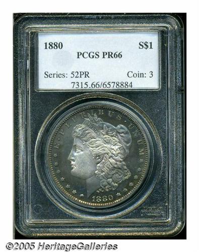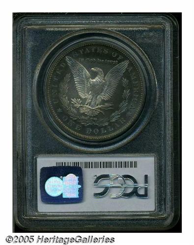 <B>1880<S$1> PR66 PCGS.</B></I> A delightful toned Gem proof which is enhanced by highly appealing deep blue at the rims with the centers remaining stark white and untoned. This is particularly true of Liberty's head, which stands out proudly surrounded by the deep blue frame in the fields. Similar on the reverse where the blue toning continues although the eagle is bright white. Exceptional surfaces and eye appeal for the collector, and this is a coin that anyone will appreciate for its many charms. Population: 31 in 66, 28 finer (6/05).