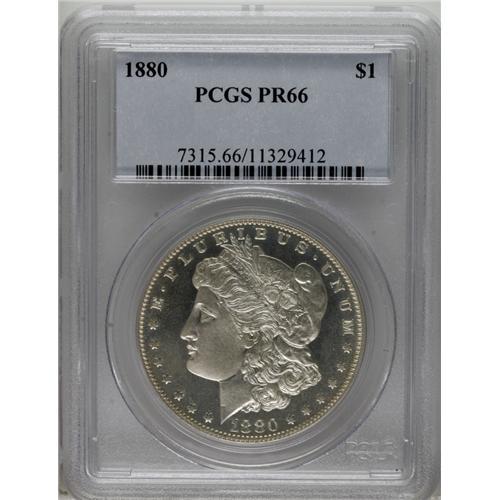 <B>1880 S$1 PR66 PCGS.</B></I> The silver-gray obverse is moderately reflective, though the reverse has considerably more flash. Boldly impressed with a touch of champagne patina on each side, a thin line of reddish-gray toning that courses through the eagle's wing and the tips of the arrows, and a handful of isolated brown spots. Breen notes that all proofs display minor repunching on the 1 in the date.<BR><BR><b>Shipping:</b> Coins & Currency (<a target="_blank" href="http://www.heritageauctions.com/common/shipping.php">view shipping information</a>)