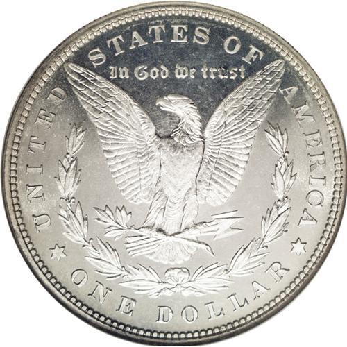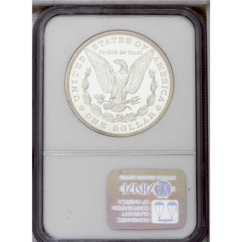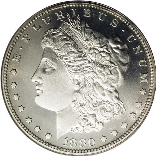 <B>1880<img border='0' src='http://www.heritagecoins.com/images/star.gif' width=10 height=10>$1> PR67 Cameo NGC.</B></I> This is a stunning Superb Gem proof example with brilliant silver surfaces. The devices have light mint frost with fully mirrored fields on both sides. The outer rims on each side display a trace of champagne toning. Sharply struck with full obverse and reverse design details, including a partial wire edge. Essentially pristine surfaces with some faint circular lines near the eagle's legs and neck, and these are as made. Similar die finishing lines have been seen on other survivors from the original mintage of 1,355 coins. This was the highest individual production figure of any proof Morgan dollar, and quite a number still survive, although most are in lower grades. Census: 21 in 67 Cameo, 10 finer (2/06).