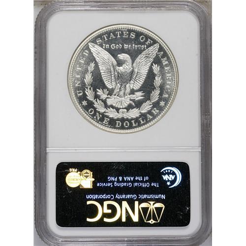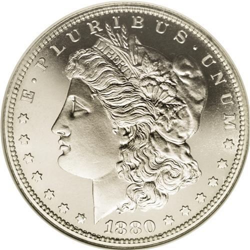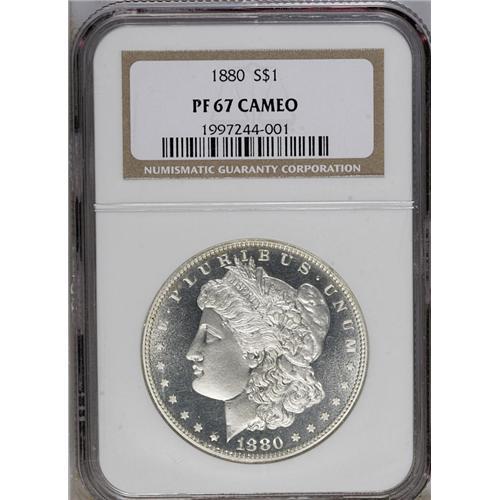 <B>1880<img border='0' src='http://www.heritagecoins.com/images/star.gif' width=10 height=10>$1> PR67 Cameo NGC.</B></I> This virtually pristine Superb Gem proof has a beautifully brilliant appearance, with snow-white devices and watery, ice-blue fields. Striking detail and surface preservation are near-perfect. Two or three faint lines are noted for accuracy's sake on Liberty's face. An impressive degree of white-on-black contrast exists on each side of this lovely specimen. Conditionally scarce in PR67 Cameo, and rare any finer. Census: 21 in 67 Cameo , 11 finer (7/06).