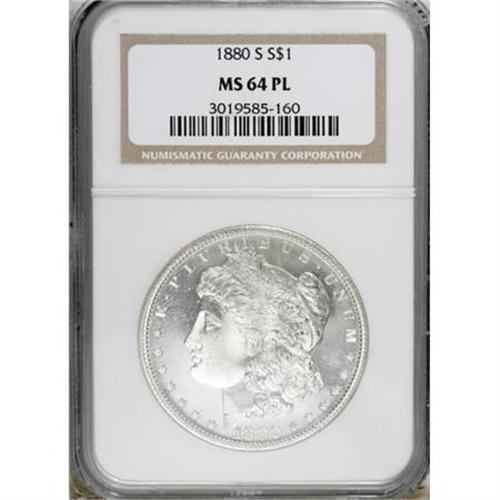 <B>1880-S $1 MS64 Prooflike NGC.</B></I> NGC Census: (3127/2669). PCGS Population (3799/3143). Numismedia Wsl. Price for NGC/PCGS coin in MS64: $100. (#7119)<BR><BR><B>Coin Engraver:</B> George T. Morgan<BR><BR><b>Shipping:</b> Coins & Currency (<a target="_blank" href="http://www.heritageauctions.com/common/shipping.php">view shipping information</a>)