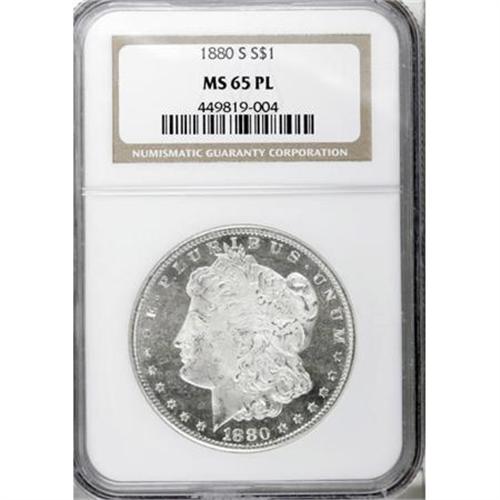 <B>1880-S $1 MS65 Prooflike NGC.</B></I> NGC Census: (1823/857). PCGS Population (2370/778). Numismedia Wsl. Price for NGC/PCGS coin in MS65: $210. (#7119)<BR><BR><B>Coin Engraver:</B> George T. Morgan<BR><BR><b>Shipping:</b> Coins & Currency (<a target="_blank" href="http://www.heritageauctions.com/common/shipping.php">view shipping information</a>)