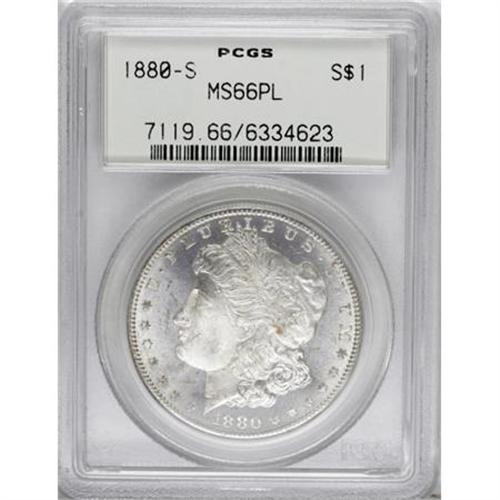 <B>1880-S $1 MS66 Prooflike PCGS.</B></I> PCGS Population (650/128). NGC Census: (696/157). Numismedia Wsl. Price for NGC/PCGS coin in MS66: $460. (#7119)<BR><BR><B>Coin Engraver:</B> George T. Morgan<BR><BR><b>Shipping:</b> Coins & Currency (<a target="_blank" href="http://www.heritageauctions.com/common/shipping.php">view shipping information</a>)