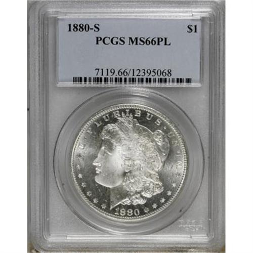 <B>1880-S $1 MS66 Prooflike PCGS.</B></I> PCGS Population (651/127). NGC Census: (695/158). Numismedia Wsl. Price for NGC/PCGS coin in MS66: $440. (#7119)<BR><BR><B>Coin Engraver:</B> George T. Morgan<BR><BR><b>Shipping:</b> Coins & Currency (<a target="_blank" href="http://www.heritageauctions.com/common/shipping.php">view shipping information</a>)