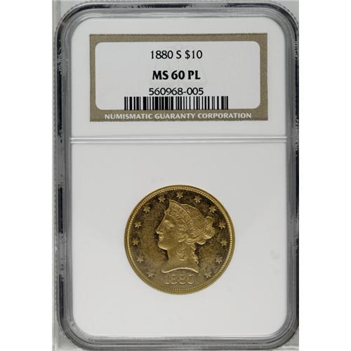 <B>1880-S<$10> MS60 Prooflike NGC.</B></I> Breen-6999. The Tiny S mintmark is placed much further southeast than is customary for the era. Crisply struck and flashy with the usual field marks for the grade. NGC has certified just two pieces as Prooflike, this example and another as MS62 Prooflike.