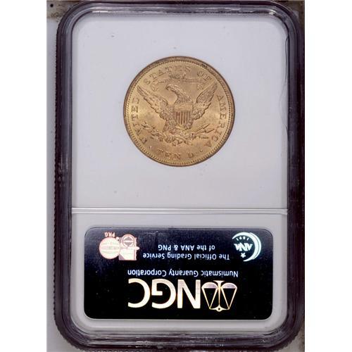 <B>1880-S<$10> MS62 NGC.</B></I> A fully lustrous and moderately abraded scarcer date Liberty eagle that possesses apricot-tinged centers and lime-tinted borders. NGC has certified just 19 pieces in finer grades. <BR><BR><B>Important notice:</B> Heritage usually auctions material at the rate of 200-250 lots per hour. On some occasions eBay Live bid software or the Internet may not be able to keep up with the pace of the auction. We recommend placing a realistic absentee bid now as insurance to avoid disappointment. Occasionally the auctioneer may eliminate or reject an eBay Live bid, and the auctioneer may also reopen a lot after the close of the eBay live bidding (usually because we missed an audience bid), and may reject your bid even if it shows you as the winning bidder. By bidding via eBay Live, you agree that Heritage may award the lot to another bidder at its sole discretion under the circumstances described above or any other reasonable circumstances. Since eBay bids are not shown to us until we open the lot on the floor, we treat those bids just like floor bids. In most cases the floor responds before the eBay bid is presented to us, due to Internet lag time, so for consistency we have made it a policy that floor bids are always considered first over tie eBay live bids. Also please note that all Heritage lots purchased through eBay Live carry a 20% Buyer's Premium. Please make sure you read the Terms and Conditions before you bid. This lot is being auctioned in conjunction with a live floor auction by Heritage Galleries & Auctioneers. All final auction and invoice information will be supplied by Heritage Galleries & Auctioneers, and all other information should be considered preliminary. Lot:3988 <BR><BR><B>Winning Notification and Billing:</B> After the FINAL session in this auction is complete, Heritage will send e-mail and snail mail invoices. This process normally takes several days. All final auction and invoice information will be supplied by Heritage Galleries & Auctioneers, and all other information should be considered preliminary. <BR><BR>This auction will be conducted on a live auction floor and over the Internet through eBay Live. If you choose to place an absentee bid, please take a moment to <font color='#0000ff'><u><a href='http://pages.ebay.com/liveauctions/help/before/laabsentee.html'>learn how eBay Live absentee bidding works</a></u></font><font color='#000000'>